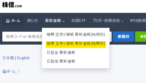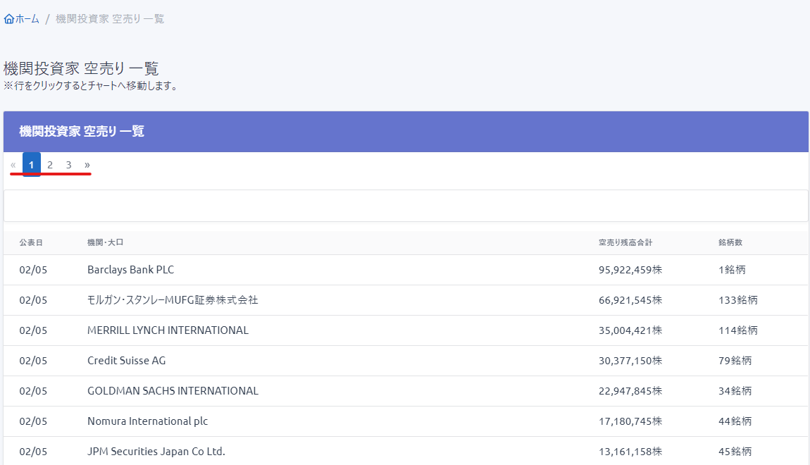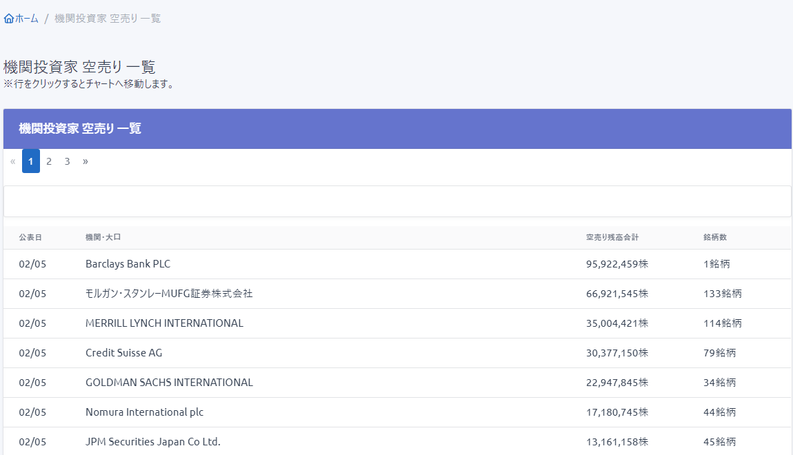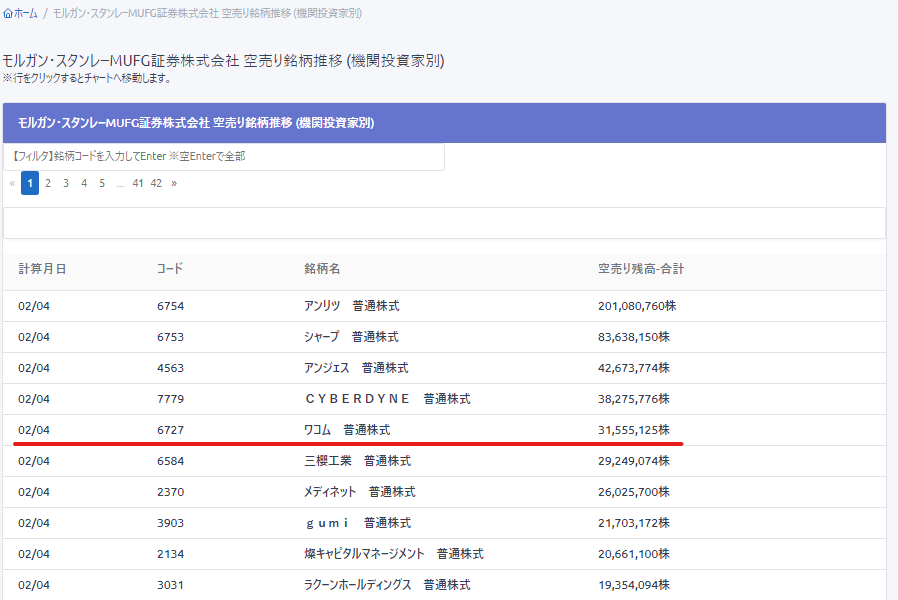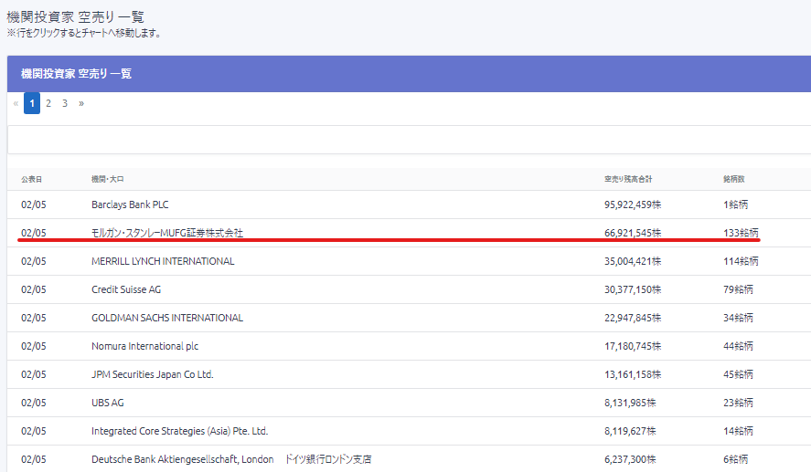 ■指定した機関の空売り銘柄と空売り残高の合計が閲覧できます。(例:モルガン・スタンレーMUFG証券の場合)
