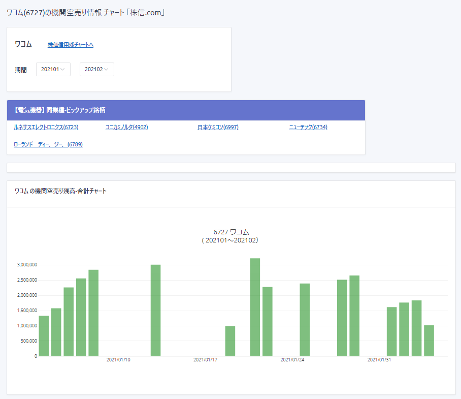 ■銘柄別の機関空売り残高推移チャートが見れます。(例:ワコム)