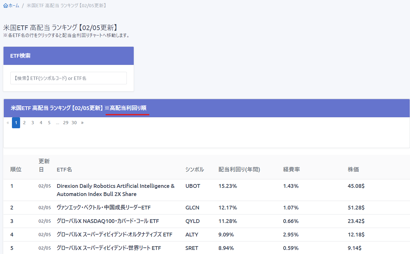 ■米国EFTが高配当順に表示されています。