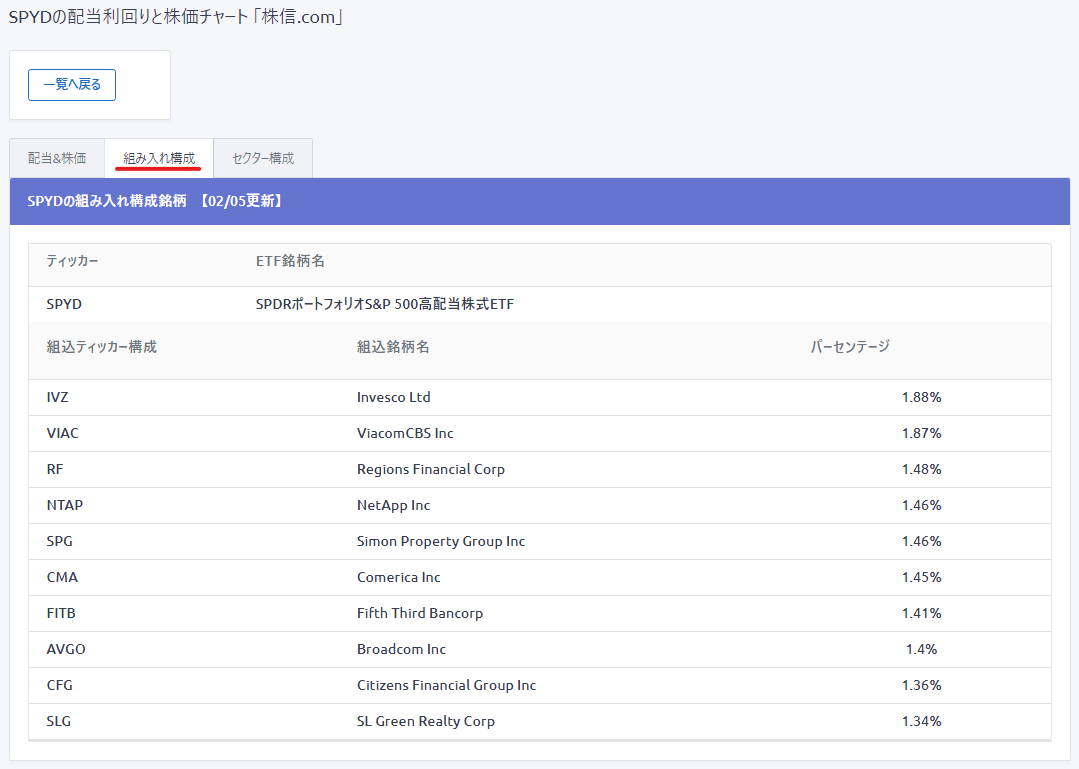 ■組み入れ銘柄を見ることもできます。(例:SPYD)