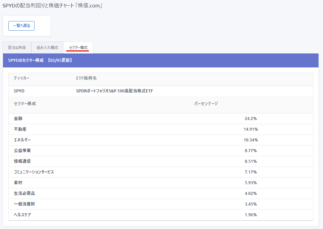 ■組み入れセクターも見ることもできます。(例:SPYD)