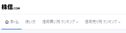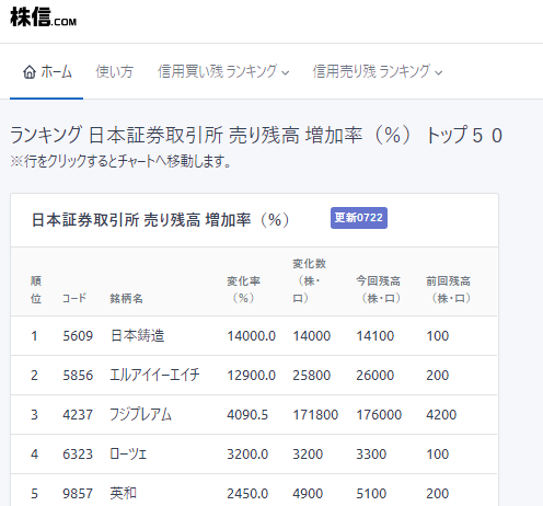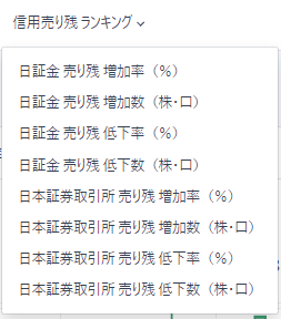 ①メニューの信用売り残 ランキングをクリックし、リストに出てきたランキングをクリックします。