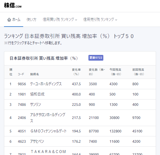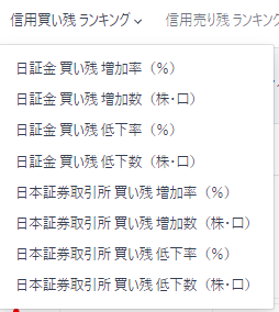 ①メニューの信用買い残 ランキングをクリックし、リストに出てきたランキングをクリックします。